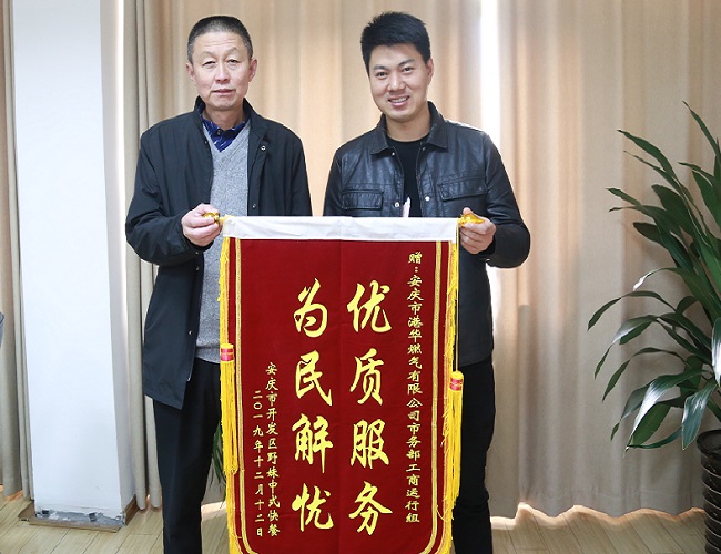 12月16日上午,市開發(fā)區(qū)野妹中式快餐負責人來到安慶港華,將一面繡有“優(yōu)質服務 為民解憂”的錦旗,贈與公司工商運行組表示感謝。