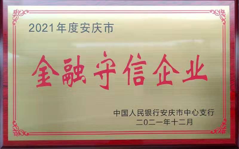 “金融守信企業(yè)”稱號系根據(jù)《安慶市金融守信企業(yè)評定實施辦法》,經(jīng)市中級人民法院、市住建委、稅務局、工商質監(jiān)局、環(huán)保局、公管局等部門評議,并由安慶市銀行行長聯(lián)席會議評定授予。