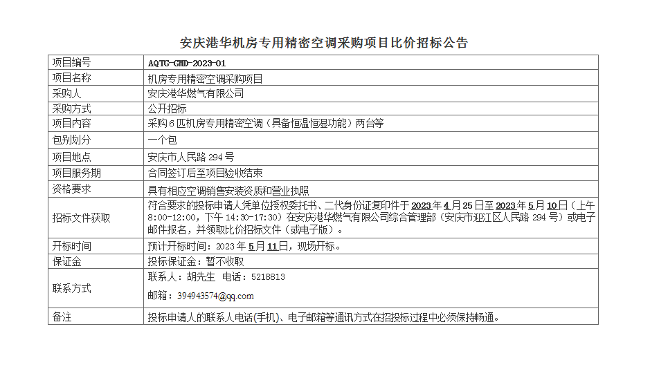安慶港華機(jī)房專用精密空調(diào)采購項(xiàng)目比價招標(biāo)公告