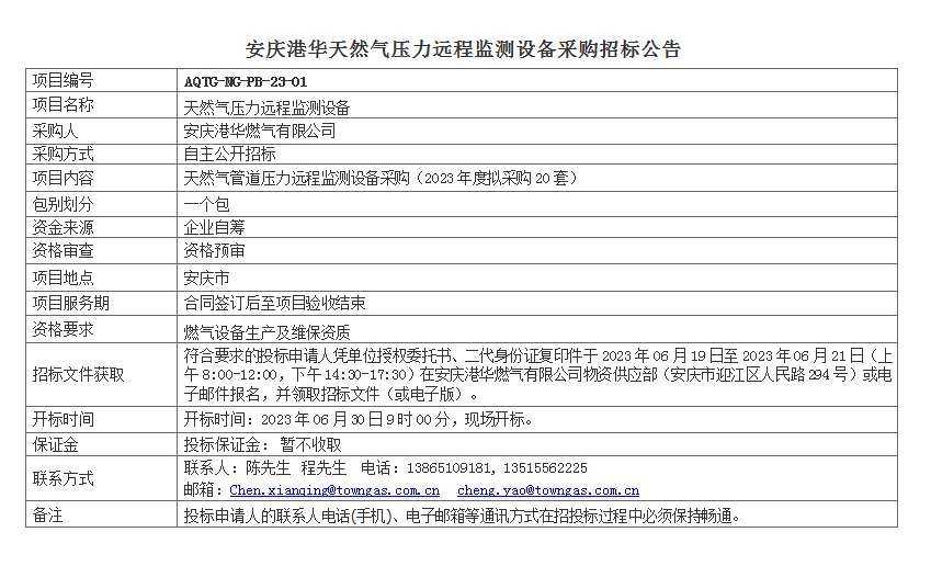 安慶港華天然氣壓力遠(yuǎn)程監(jiān)測(cè)設(shè)備采購(gòu)招標(biāo)公告