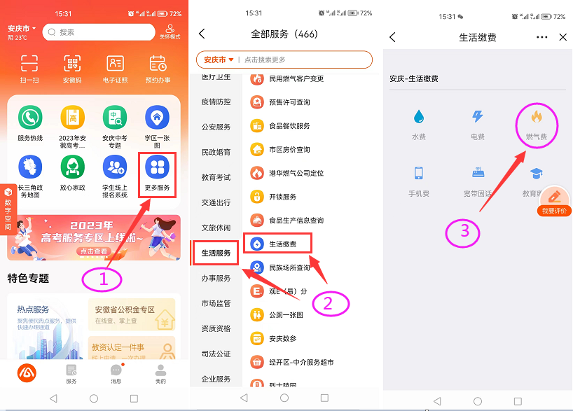 皖事通:安裝并打開(kāi)皖事通APP,進(jìn)入“更多服務(wù)”-選擇“生活服務(wù)”-“生活繳費(fèi)”,點(diǎn)擊“燃?xì)赓M(fèi)繳納”即可繳納燃?xì)赓M(fèi)或者預(yù)存氣費(fèi)。