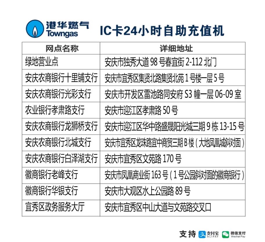 目前我公司支持交通銀行、徽商銀行、郵政儲(chǔ)蓄銀行、工商銀行、農(nóng)業(yè)銀行和浦發(fā)銀行的網(wǎng)上銀行和手機(jī)銀行,以及移動(dòng)“中國(guó)移動(dòng)”、電信“翼支付”、我公司微信公眾號(hào)和在“微信”-“生活繳費(fèi)”、“支付寶”-“生活繳費(fèi)”中查詢(xún)?nèi)細(xì)赓M(fèi)并繳納欠費(fèi)或預(yù)存氣費(fèi)。