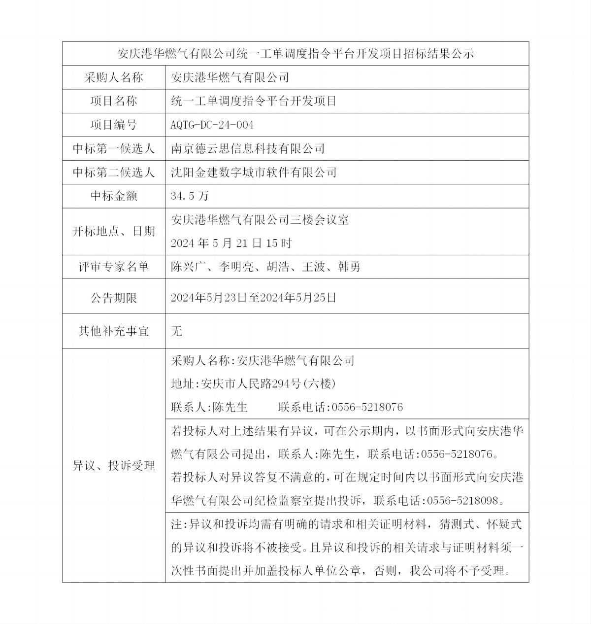 安慶港華燃氣有限公司統(tǒng)一工單調(diào)度指令平臺開發(fā)項目招標結果公示