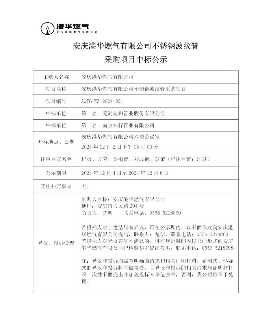 安慶港華燃?xì)庥邢薰静讳P鋼波紋管采購(gòu)項(xiàng)目中標(biāo)公示