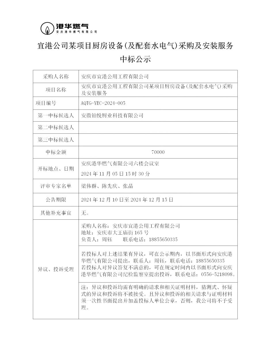 宜港公司某項(xiàng)目廚房設(shè)備(及配套水電氣)采購及安裝服務(wù)中標(biāo)公示