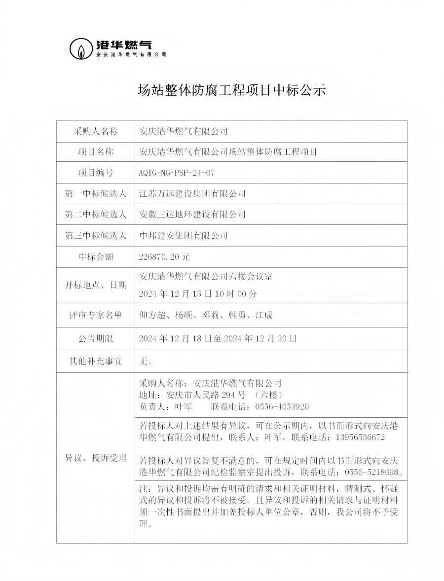 場(chǎng)站整體防腐工程項(xiàng)目中標(biāo)公示