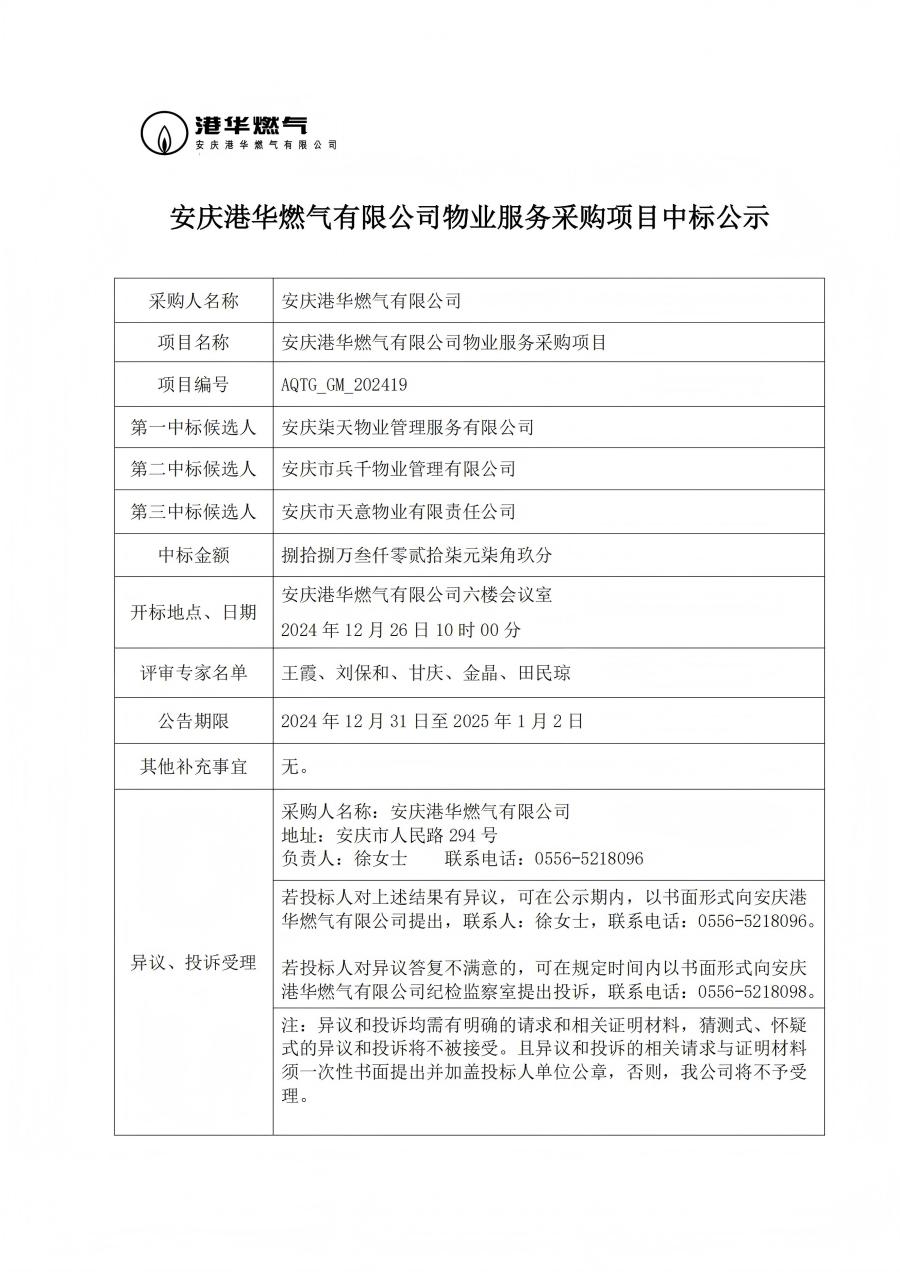 安慶港華燃?xì)庥邢薰疚飿I(yè)服務(wù)采購(gòu)項(xiàng)目中標(biāo)公示