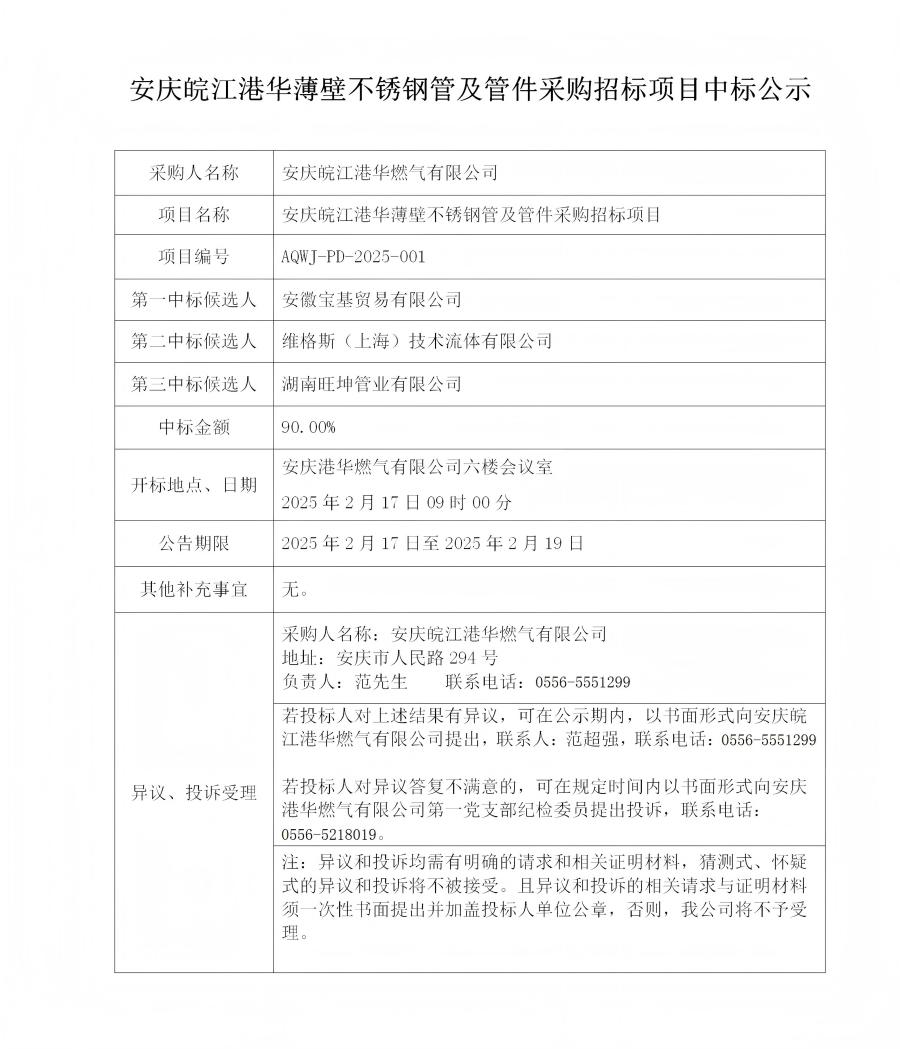 安慶皖江港華薄壁不銹鋼管及管件采購招標項目中標公示