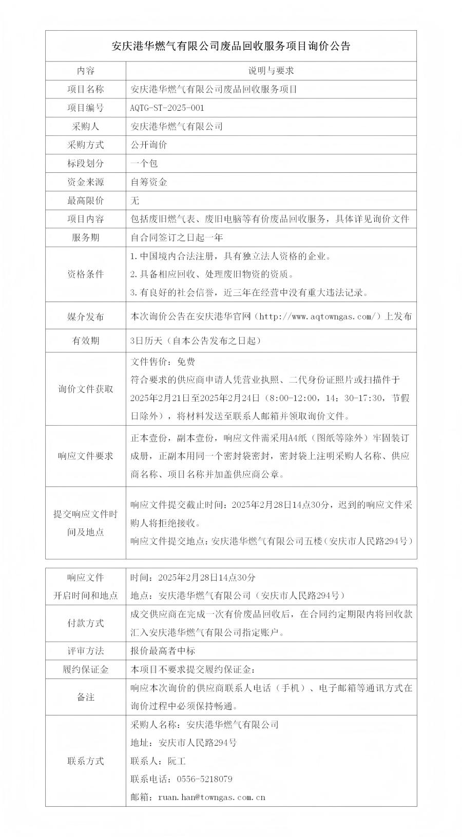 安慶港華燃氣有限公司廢品回收服務項目詢價公告