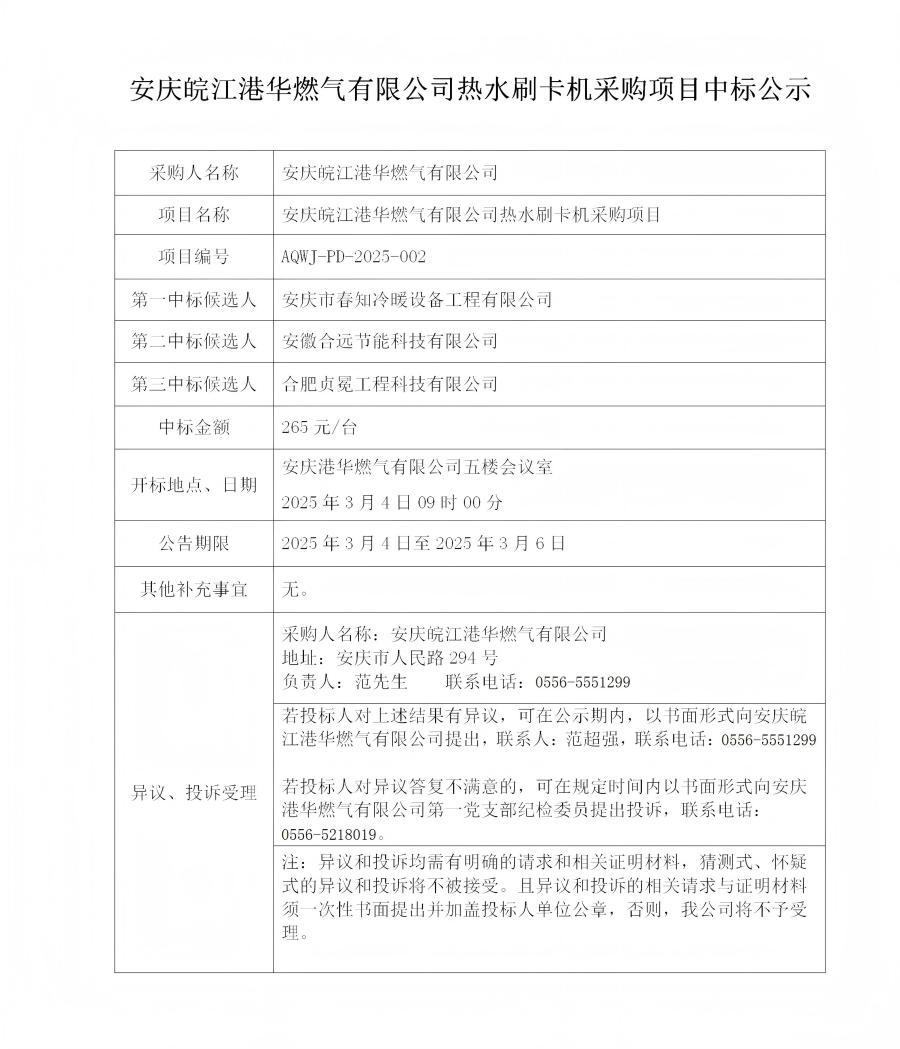 安慶皖江港華燃?xì)庥邢薰緹崴⒖C采購項目中標(biāo)公示