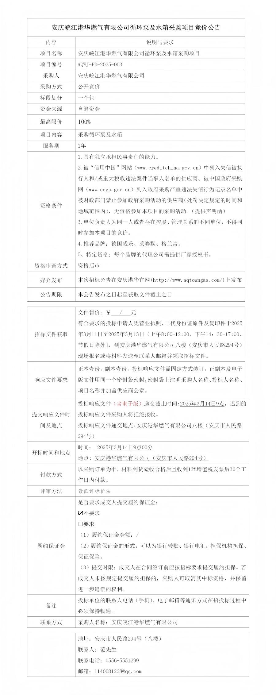 安慶皖江港華燃?xì)庥邢薰狙h(huán)泵及水箱采購項(xiàng)目競(jìng)價(jià)公告