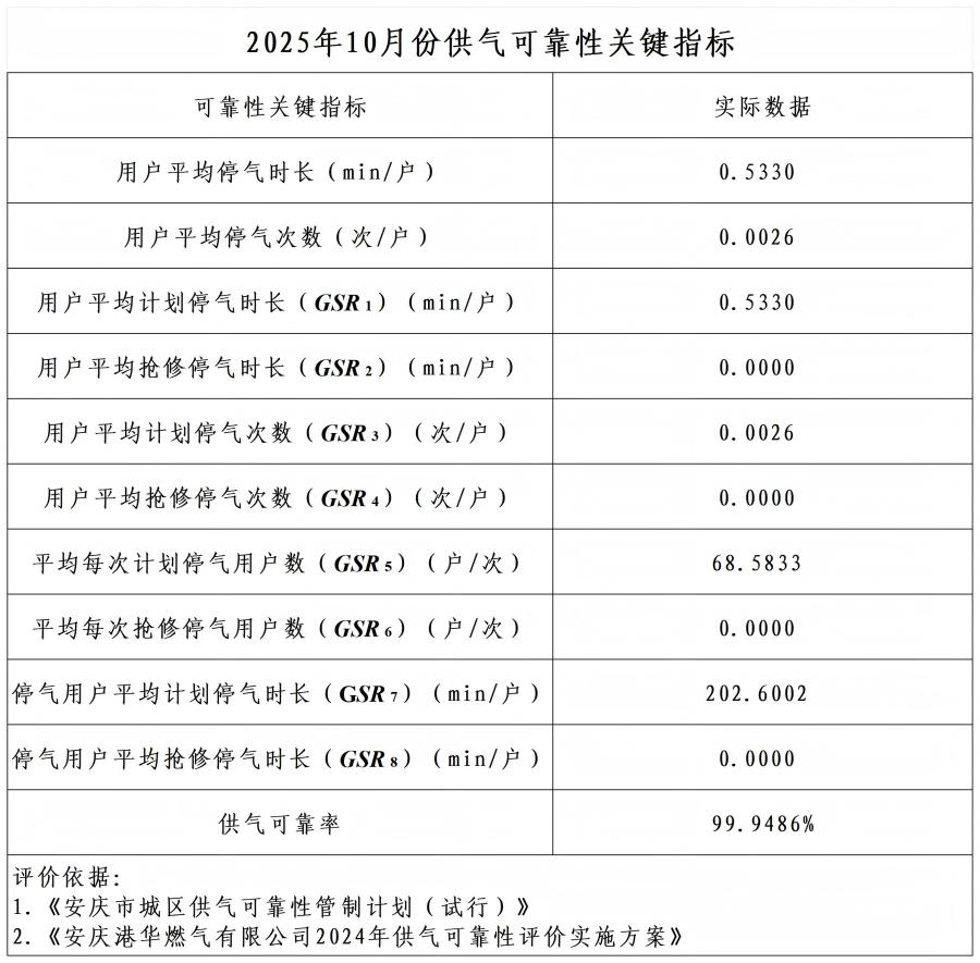 2025年10月供氣可靠性關(guān)鍵指標(biāo)