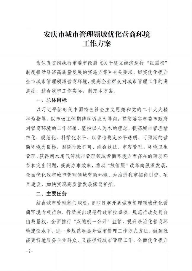 安慶市城市管理局關于印發(fā)城市管理領域優(yōu)化營商環(huán)境工作方案的通知
